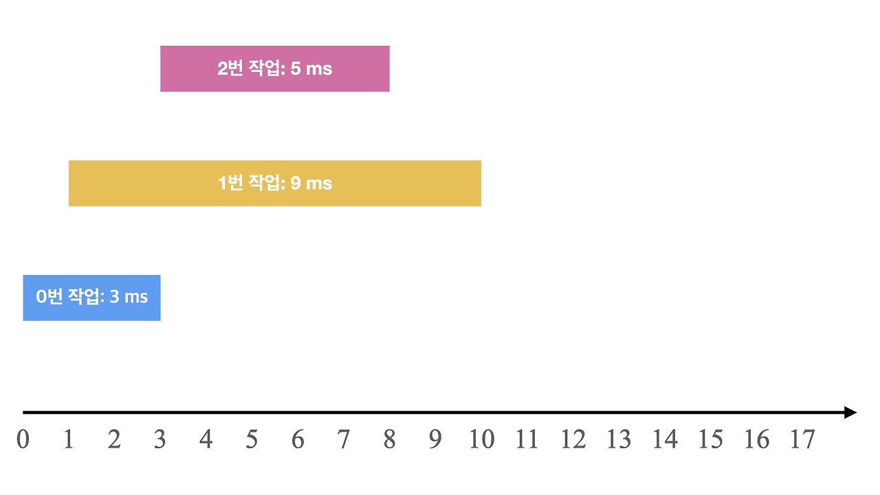 - 3ms 시점에 5ms가 소요되는 2번 작업 요청