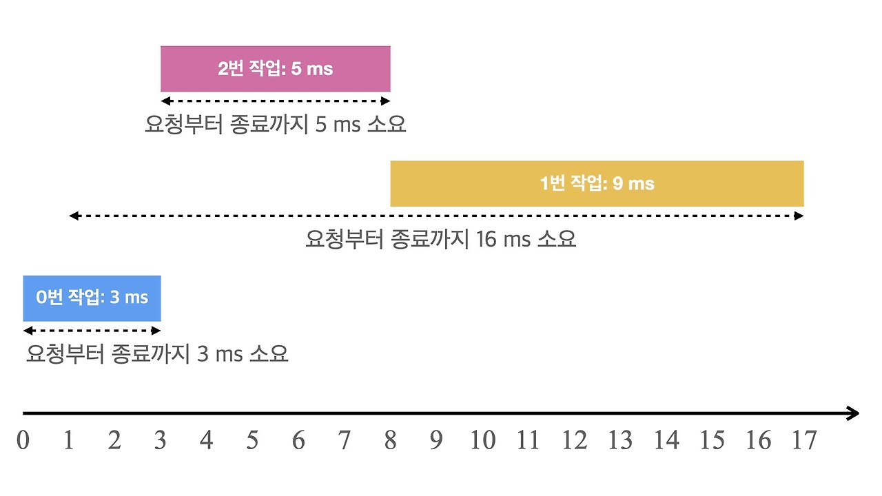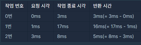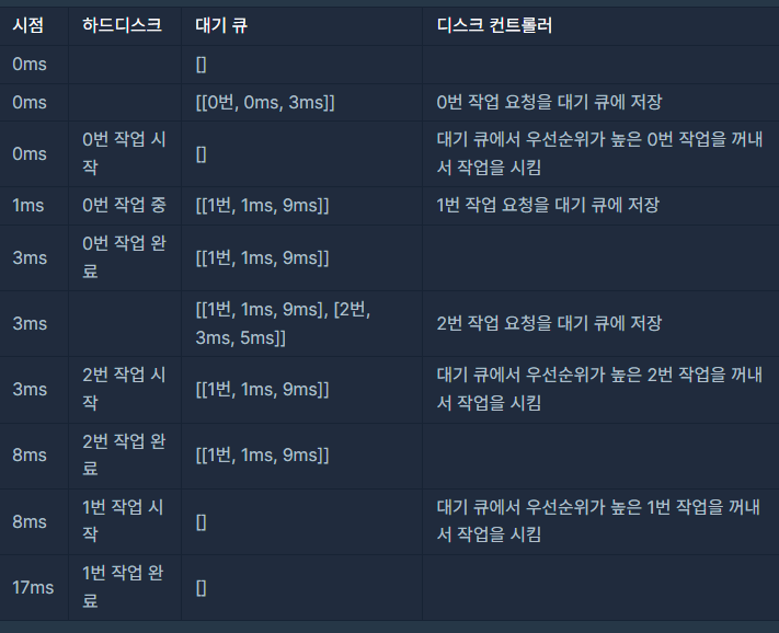 우선순위 디스크 컨트롤러에서 모든 요청 작업의 반환 시간의 평균은 8ms(= (3ms + 16ms + 5ms) / 3)가 됩니다.