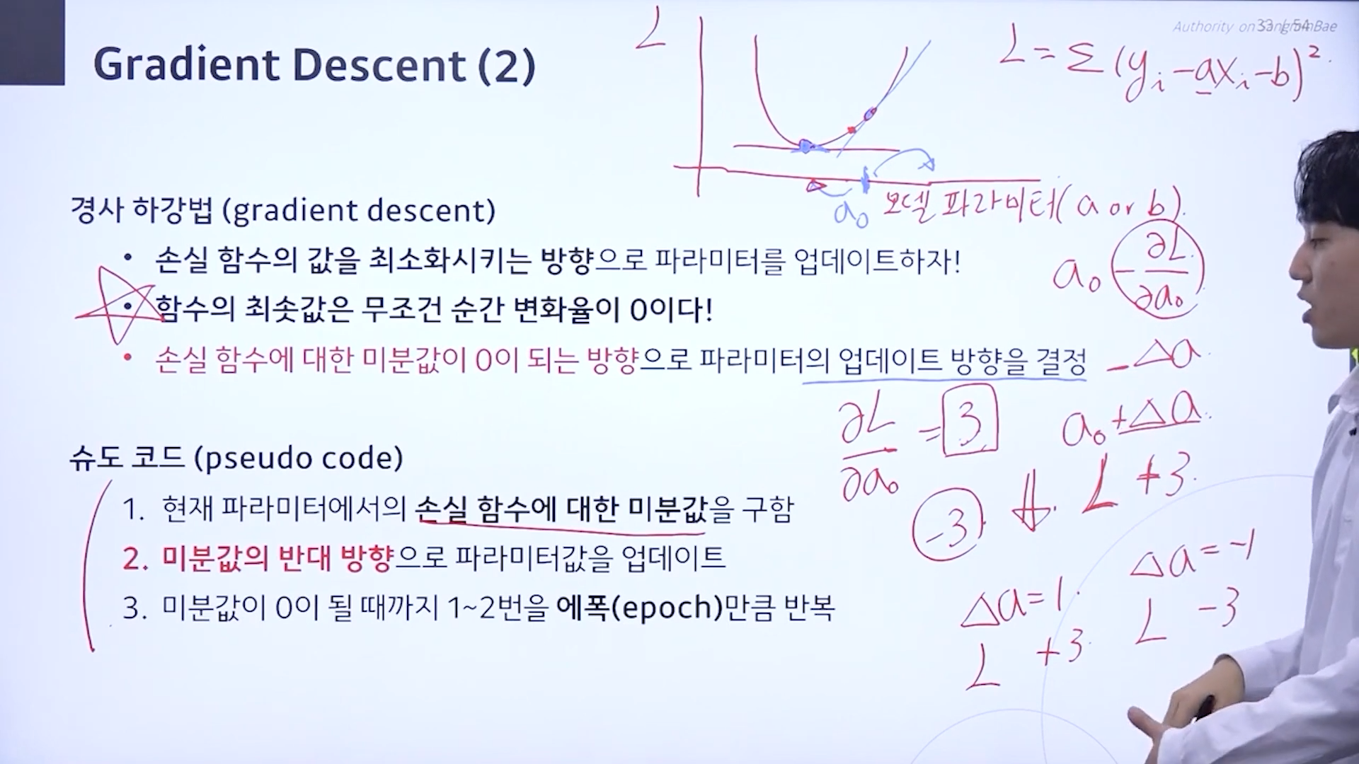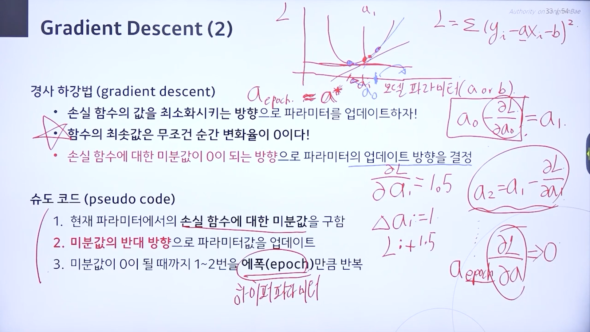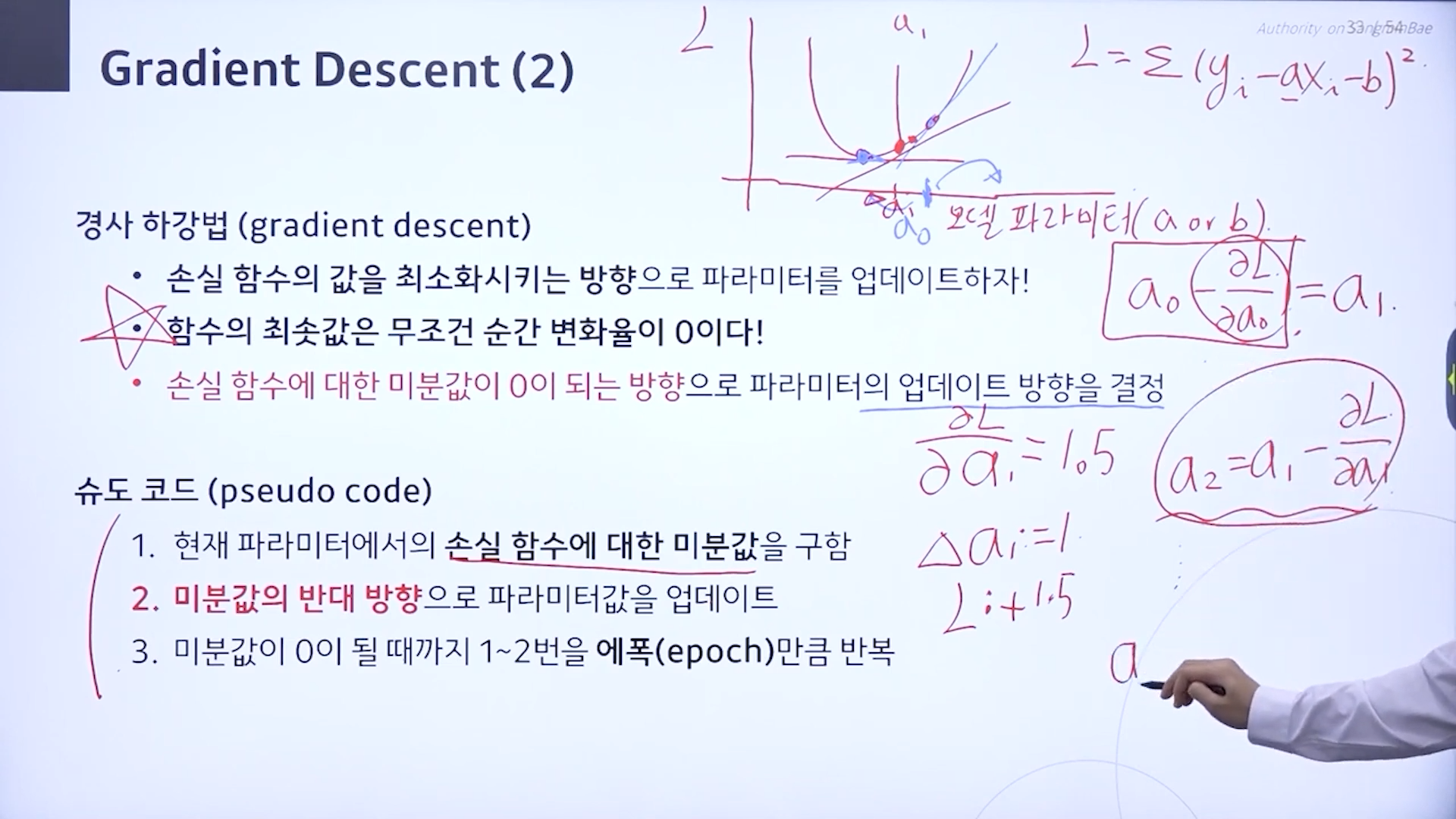 손실함수에 대한 미분값. a0에대한 편미분값이 3이 나올때, 순간변화율이 3이라는 것은 a0가 순각적으로 커졌을경우 3이 플러스된다는 의미. 우리는 손실함수값을 줄이는 것이 목적. -를 붙여줌.마이너스를 해주어야 손실함수값이 낮아지는곳으로 가게 됨. 미분값의 반대방향으로 모델 파라미터 업데이트. ->a0에다가 손실함수 미분값을 통해 얻은 값을 마이너스해줌=a1