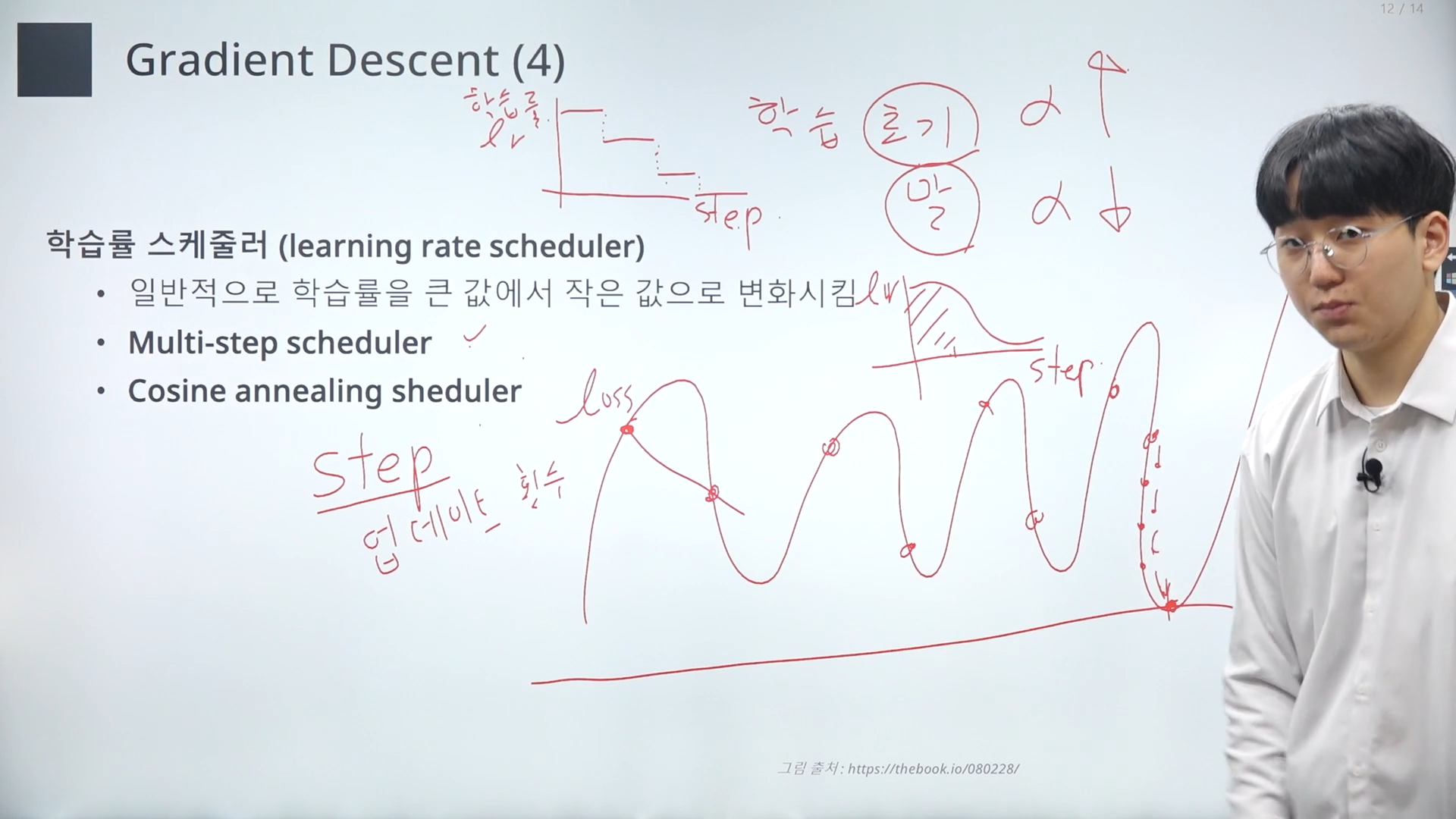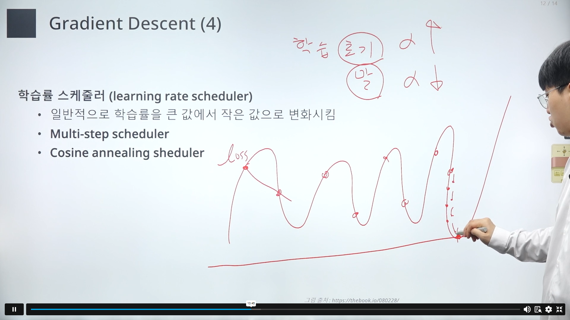 손실(loss)그래프가 있을때 최적의 포인트를 향해 나아감. 처음에는 크게크게 가다가 나중에는 근처에 도달했을테니 천천히 가게 함.