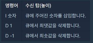 - 원소는 “명령어 데이터” 형식으로 주어집니다.- 최댓값/최솟값을 삭제하는 연산에서 최댓값/최솟값이 둘 이상인 경우, 하나만 삭제합니다.
