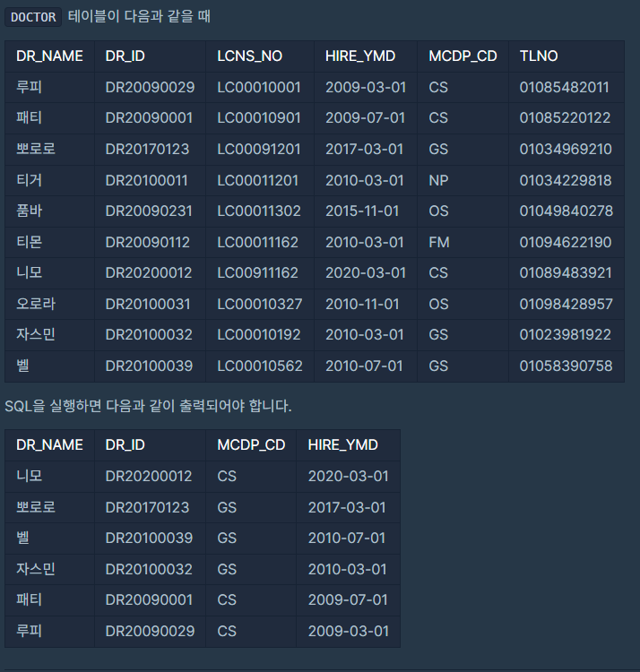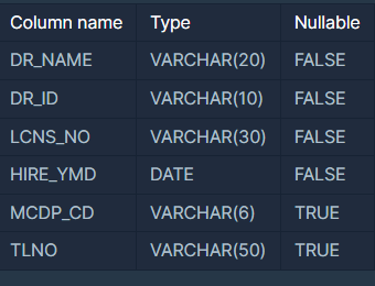 다음은 종합병원에 속한 의사 정보를 담은DOCTOR 테이블입니다. DOCTOR 테이블은 다음과 같으며 DR_NAME, DR_ID, LCNS_NO, HIRE_YMD, MCDP_CD, TLNO는 각각 의사이름, 의사ID, 면허번호, 고용일자, 진료과코드, 전화번호를 나타냅니다.