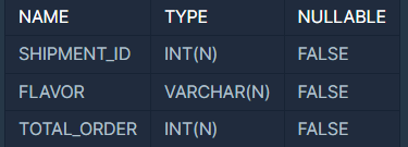 ICECREAM_INFO 테이블 구조는 다음과 같으며, FLAVOR, INGREDITENT_TYPE 은 각각 아이스크림 맛, 아이스크림의 성분 타입을 나타냅니다. INGREDIENT_TYPE에는 아이스크림의 주 성분이 설탕이면 sugar_based라고 입력되고, 아이스크림의 주 성분이 과일이면 fruit_based라고 입력됩니다. ICECREAM_INFO의 기본 키는 FLAVOR입니다. ICECREAM_INFO테이블의 FLAVOR는 FIRST_HALF 테이블의 FLAVOR의 외래 키입니다.