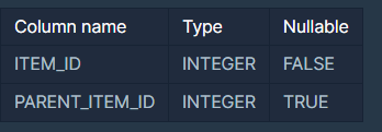 단, 각 아이템들은 오직 하나의 PARENT 아이템 ID를 가지며, ROOT 아이템의 PARENT 아이템 ID는 NULL 입니다.