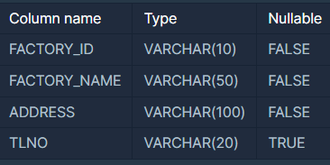 다음은 식품공장의 정보를 담은 FOOD_FACTORY 테이블입니다. FOOD_FACTORY 테이블은 다음과 같으며 FACTORY_ID, FACTORY_NAME, ADDRESS, TLNO는 각각 공장 ID, 공장 이름, 주소, 전화번호를 의미합니다.
