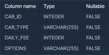 다음은 어느 자동차 대여 회사에서 대여중인 자동차들의 정보를 담은 CAR_RENTAL_COMPANY_CAR 테이블입니다. CAR_RENTAL_COMPANY_CAR 테이블은 아래와 같은 구조로 되어있으며, CAR_ID, CAR_TYPE, DAILY_FEE, OPTIONS 는 각각 자동차 ID, 자동차 종류, 일일 대여 요금(원), 자동차 옵션 리스트를 나타냅니다.
