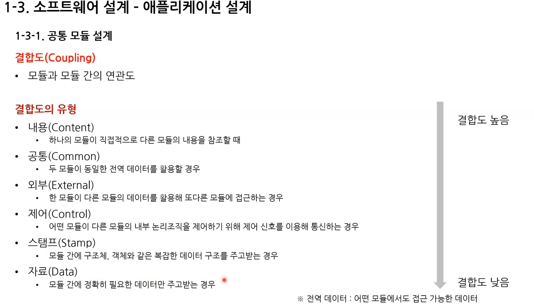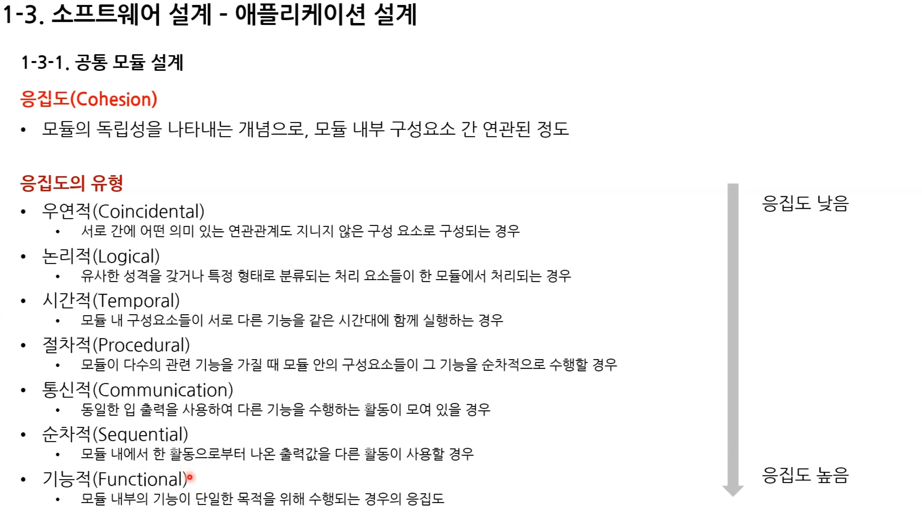 응집도->독립성을 나타냄. 모듈 내부 구성요소 간 연관된 정도