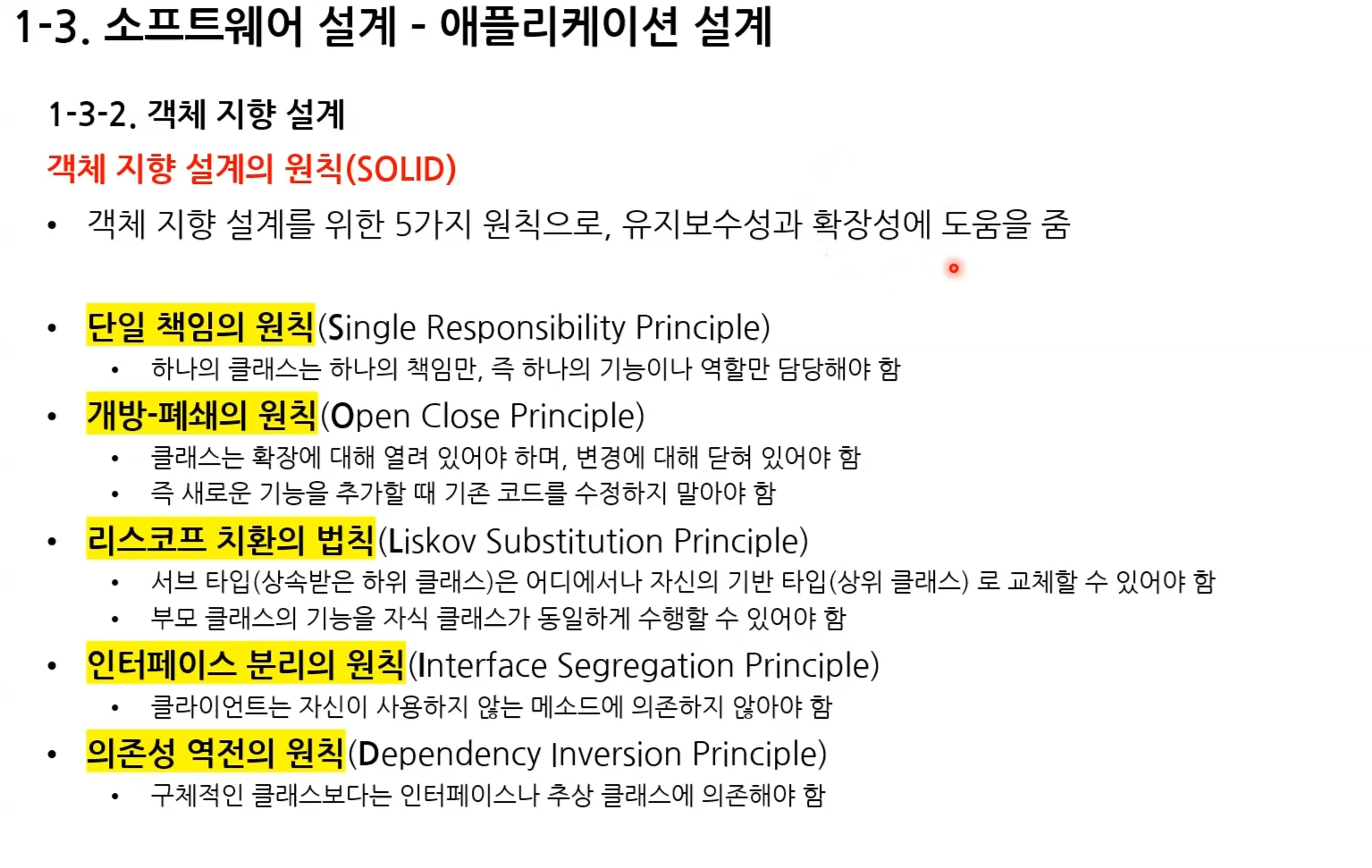 -간일책임,개방폐쇄,리스코프치환,인터페이스분리,의존성역전.