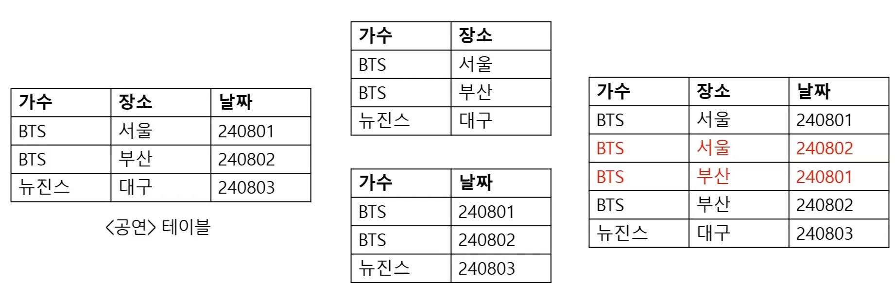 -카르테시안 곱 : 각 릴레이션의모든 튜플 쌍을 조합하는 새로운 릴레이션을 생성. 카티션 프로덕트의 결과로 생긴 릴레이션의 카디널리티는 각 릴레이션 카디널리티의 곱이 됨.