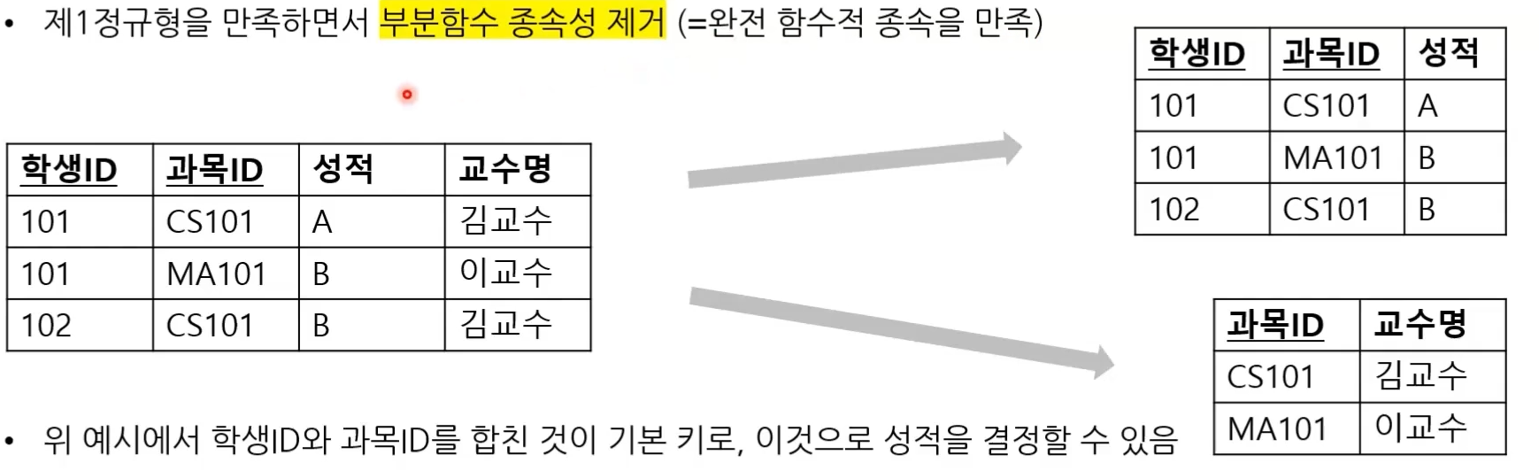 부분함수 종속성->교수명은 과목ID만 알아도 알 수 있어서 기본키의 일부에만 종속된 상황.