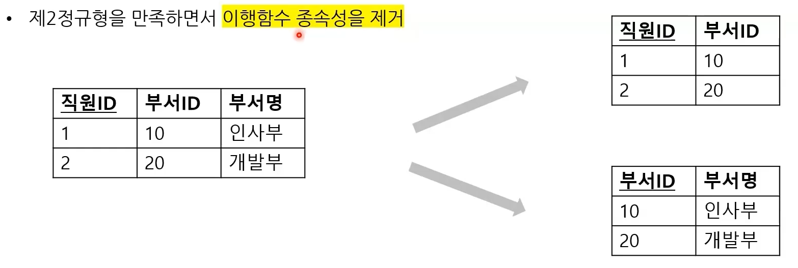 직원ID가 부서ID를 결정하고, 부서ID는 부서명을 결정하므로 직원ID->부서명이라는 이행함수 종속성 발생