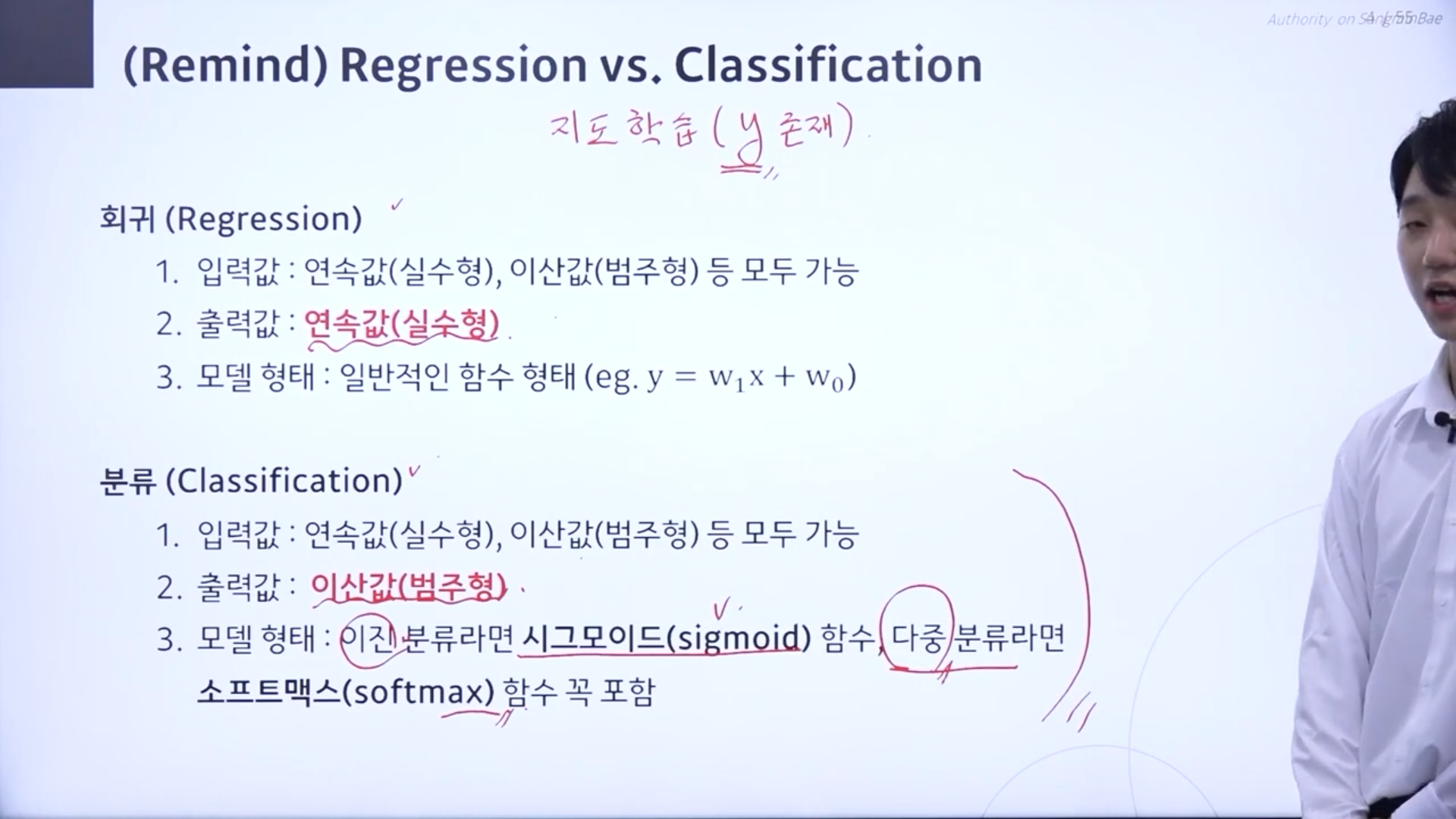 분류보델에서는 이진 분류라면 시그모이드 함수를 사용하고 다중 분류라면 소프트맥스함수를 사용한다.
