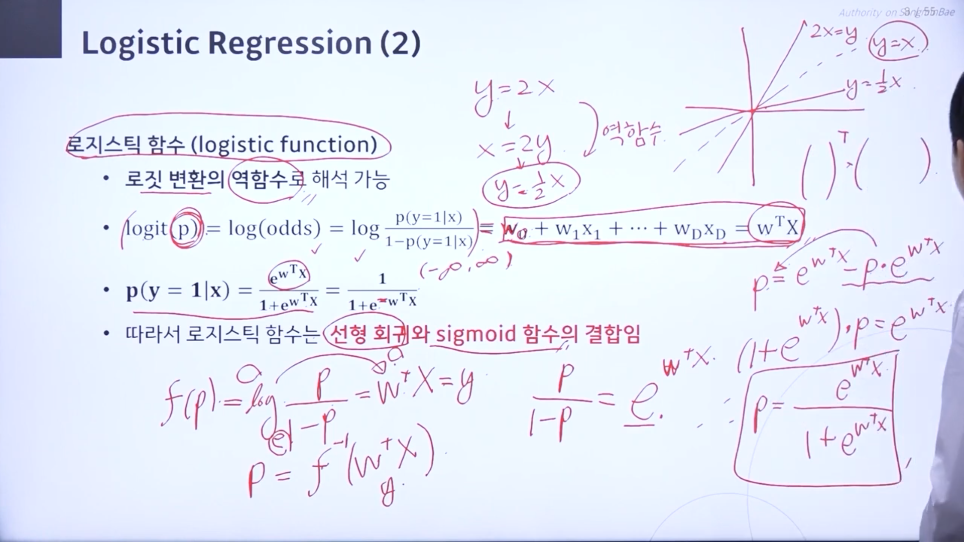 ->로짓변환에 역함수를 취하여 정리해주면 선형 회귀와 시그모이드 함수의 결합이 됨.