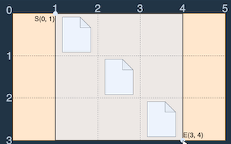 드래그는 바탕화면의 격자점 S(lux, luy)를 마우스 왼쪽 버튼으로 클릭한 상태로 격자점 E(rdx, rdy)로 이동한 뒤 마우스 왼쪽 버튼을 떼는 행동입니다. 이때, "점 S에서 점 E로 드래그한다"고 표현하고 점 S와 점 E를 각각 드래그의 시작점, 끝점이라고 표현합니다. 점 S(lux, luy)에서 점 E(rdx, rdy)로 드래그를 할 때, "드래그 한 거리"는 |rdx - lux| + |rdy - luy|로 정의합니다. 점 S에서 점 E로 드래그를 하면 바탕화면에서 두 격자점을 각각 왼쪽 위, 오른쪽 아래로 하는 직사각형 내부에 있는 모든 파일이 선택됩니다.